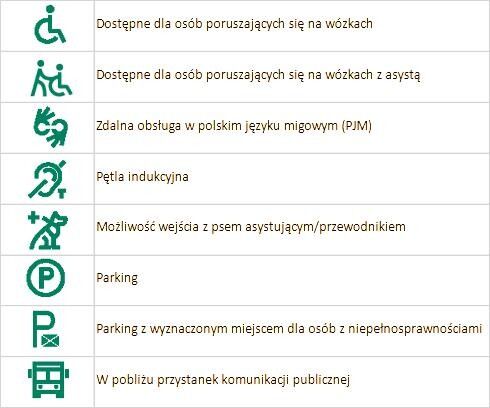 Symbole graficzne (znajdujące się na stronie internetowej) wraz z ich opisem, którymi posługujemy się dla opisu dostępności architektonicznej/udogodnień w naszych placówkach: